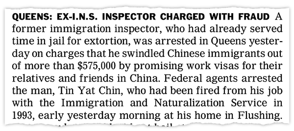 In 1993, Mr. Chin lost his immigration job when federal agents found $1,700 in his pocket, money he had extorted from a Chinese businessman. The man had landed at Kennedy and claimed political asylum. Mr. Chin said he would send him back to China unless he handed over his money. Hours later, federal agents arrested Mr. Chin. He pleaded guilty and spent nearly a year in prison.