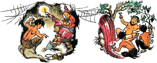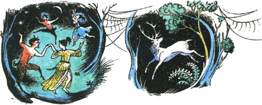 And really it was a wonderful tea. There was a nice brown egg, lightly boiled, for each of them, and then sardines on toast, and then buttered toast, and then toast with honey, and then a sugar-topped cake. And when Lucy was tired of eating, the Faun began to talk. He had wonderful tales to tell of life in the forest. He told about the midnight dances and how the Nymphs who lived in the wells and the Dryads who lived in the trees came out to dance with the Fauns; about long hunting parties after the milk-white stag who could give you wishes if you caught him; about feasting and treasure-seeking with the wild Red Dwarfs in deep mines and caverns far beneath the forest floor; and then about summer when the woods were green and old Silenus on his fat donkey would come to visit them, and sometimes Bacchus himself, and then the streams would run with wine instead of water and the whole forest would give itself up to jollification for weeks on end. “Not that it isn’t always winter now,” he added gloomily. Then to cheer himself up he took out from its case on the dresser a strange little flute that looked as if it were made of straw and began to play. And the tune he played made Lucy want to cry and laugh and dance and go to sleep all at the same time. It must have been hours later when she shook herself and said: