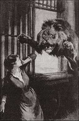 “It was a pitch-dark night when my husband and I went down, as was our custom, to feed the beast. We carried with us the raw meat in a zinc pail. Leonardo was waiting at the corner of the big van which we should have to pass before we reached the cage. He was too slow, and we walked past him before he could strike, but he followed us on tiptoe and I heard the crash as the club smashed my husband’s skull. My heart leaped with joy at the sound. I sprang forward, and I undid the catch which held the door of the great lion’s cage.